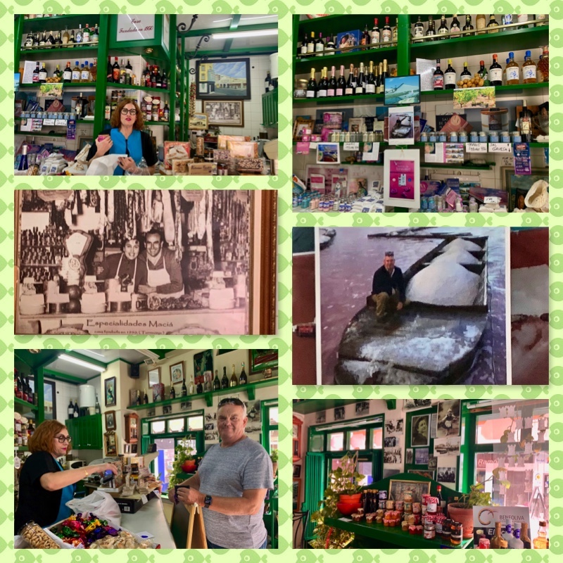 En dag i november var vi ner på stan och kollade in ”saltbutiken” som ligger bredvid saluhallen. Mycket smått & gott att välja på i butiken. Frågade ägarinnan om jag fick fota inne i affären, det var helt okej. Sen började hon berätta om hennes föräldrar (svartvita fotot) som startade upp verksamheten Casa Maciá 1950. Hennes man jobbade ute på Salinas salthögar (fotot med saltvagnarna). Det var väldigt intressant att höra henne berätta om Torrevieja saltet och hur allt startade en gång i tiden.
