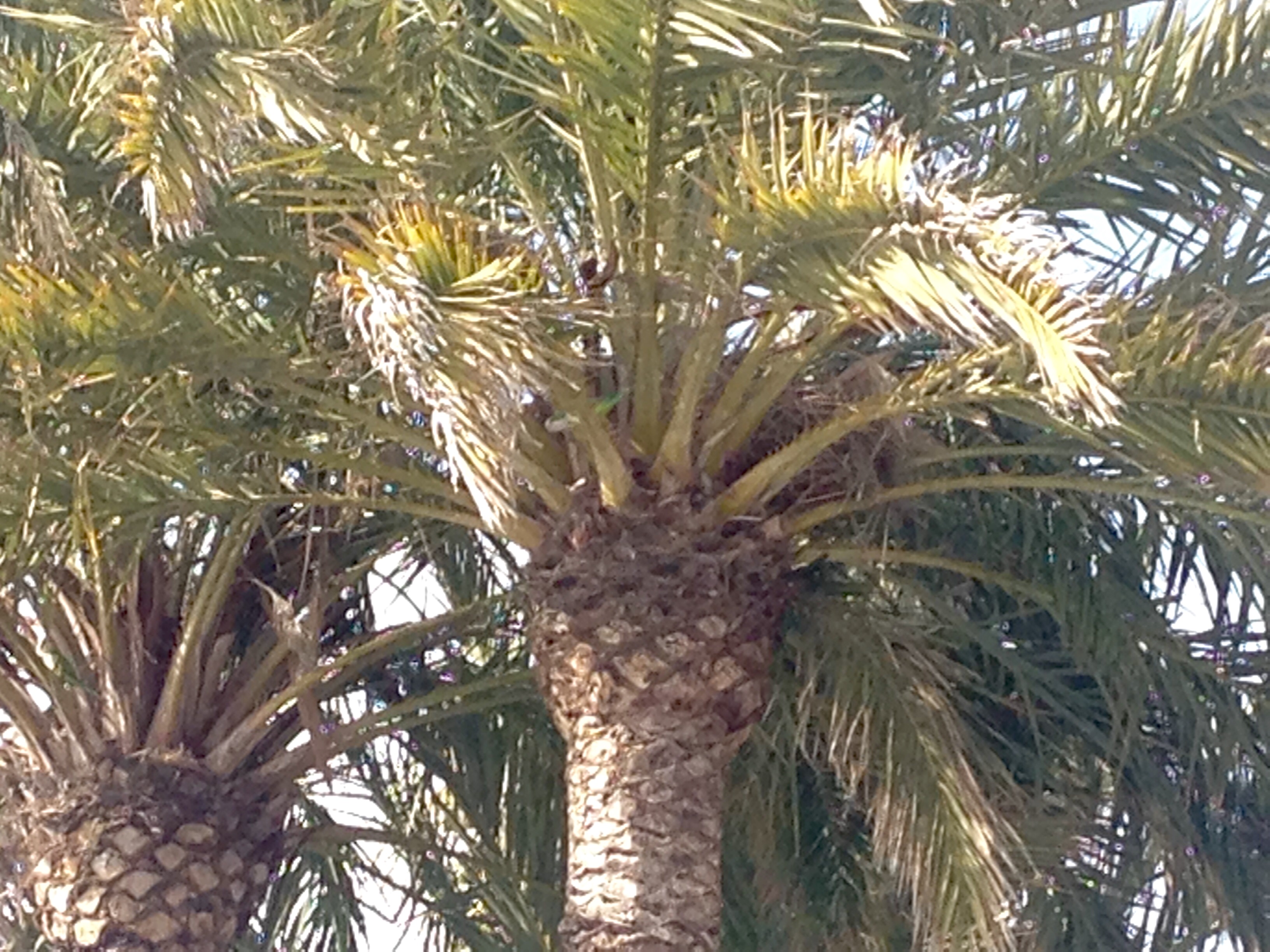 G   HNär vi gick förbi ”palmparken” hördes fåglarna tjattra uppe i någon av palmerna. Försökte lokalisera varifrån ljudet kom och till slut hittade vi en av fåglarna. Om man tittar riktigt noga så kan man se en undulat i den högra palmen.