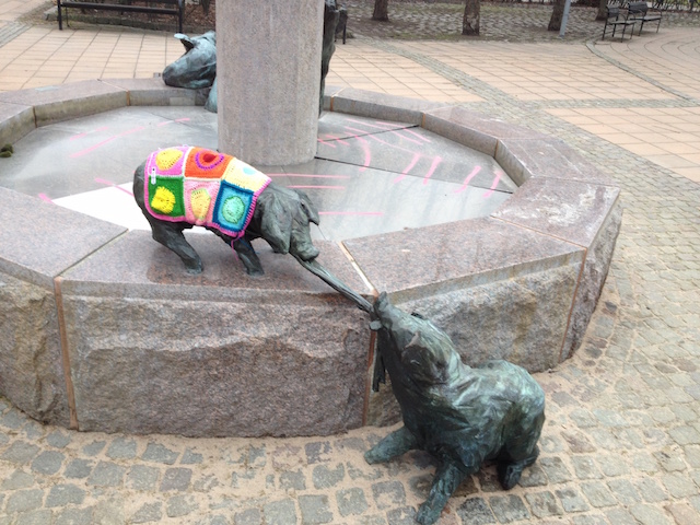 IMG_0023 kopiaDen här bilden tog jag en vinterdag för några år sen och döpte då bilden till ”Svinkallt! Det året var det någon eller några som stickade eller virkade kläder, mössor, halsdukar och satte på stans olika statyer, staket, cyklar, stolpar ja i princip överallt i hela stan. Mysigt!
