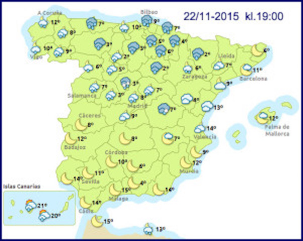 Det varma vädret varar fram till fredagen i hela landet, polarfronten beräknas nå norra Spanien under lördagen och under söndagen är den framme även i den södra delen. Även Balearerna och Kanarieöarna påverkas av polarfronten. Det förväntas rätt allmänt kunna bli minusgrader i stora delar av inlandet, först efter en fyra, fem dagar så skall det bli något varmare igen.