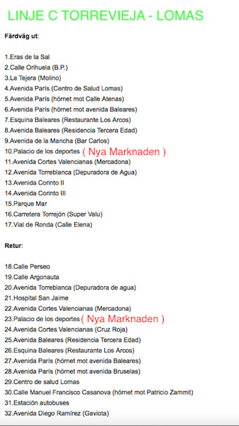 När man åker till marknaden kliver man av vid hållplats nr 10 Palacio de los deportes och när man åker därifrån kliver man på vid samma hållplats som man klev av, fast då är det hållplats nr 23 som gäller på bussturlistan och sen går bussen (nr 23 – 32) tillbaka ner till Eras de Sal igen.