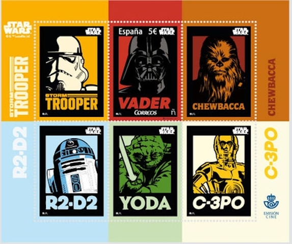 Spanska postverket Correos har tecknat ett avtal med Walt Disney för att uppmärksamma 40-årsjubiléet av den klassiska rymdsagan. Det inkluderar en samling av sex olika frimärken med några av de populäraste figurerna från Star Wars. De är tryckta med en särskild teknik som ger både djup och perspektiv och kostar fem euro per serie.