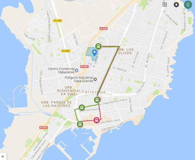 Buss Mercado linje H, grön linje, C-bussen, röd linje 🚌🚌 (Turismo de Torrevieja)