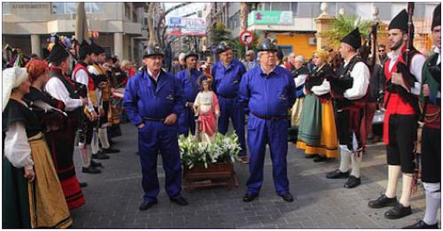 Redan på morgonen i början på december månad går en procession med helgonet, Santa Barbara, från Centro de Asturias genom staden till kyrkan Santa Ana i södra delen av Torrevieja. Hon bärs av fyra gruvarbetare i full mundering med hjälmar och pannlampor, åtföljda av asturianer i folkdräkter, spelande sina instrument. Förklaringen är att Torrevieja är vänort till Oviedo i Asturias och Santa Barbara är gruvarbetarnas skyddshelgon, som nu bärs in i kyrkan för att välsignas. (Birgitta Kruckenberg, Aktiv i Torrevieja)