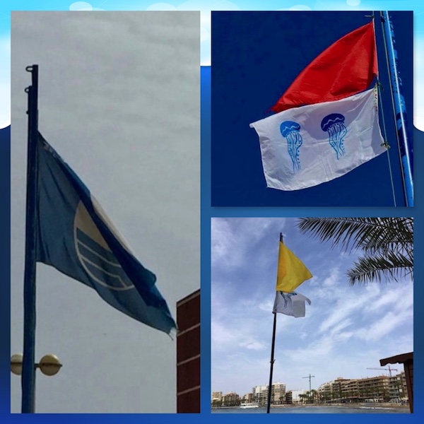 De blåa flaggor som sitter på stränderna nu är en utmärkelse för att det är så rent i vattnet bland annat. Har inget att göra med om det är rätt att bada just nu. Röd flagg är lika med badförbud (600 euro i böter). Gul flagg bad på egen risk. Vita flaggan under är en manetflagg. Den Portugisiska Örlogsmannen som skvalpar runt just nu är ingen manet egentligen, men flaggan är densamma.              (har lånat detta info av Marianne Larsson Fd Sabelström)