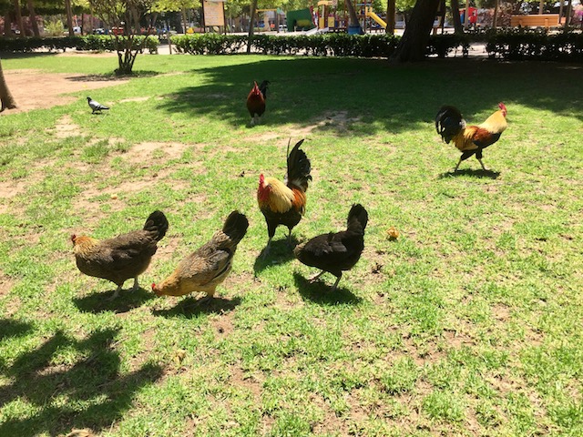 Medan vi satt och åt studerade vi tupparnas beteende mot hönorna, när vi kastade några små brödbitar åt dom. Tuppen tog brödbiten och började kackla på ett speciellt sätt och då dök flera hönor upp. Tuppen gav bort brödbiten till hönorna som började pickade i sig brödet. Vilken gentleman!